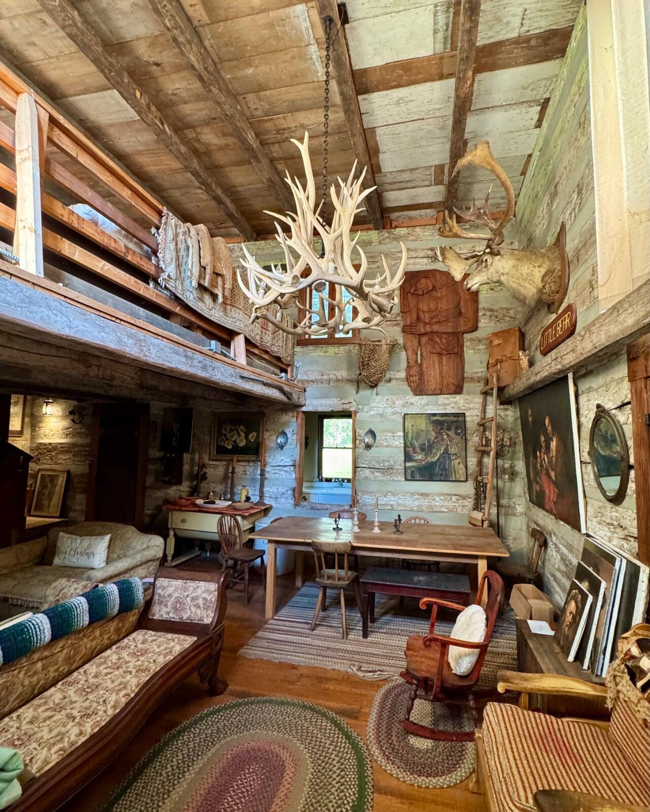 Putting it back together took 2 years, a crane, and lots of help from friends. Connally personally put months of work into reconditioning each log. Him and his wife are passionately positioned in the field of preservation, Maria Daily herself starting the Santa Cruz Island Foundation. They help each other with these endeavors, and have slowly turned this cabin guesthouse into a trove of artifacts and period pieces. 14 pairs of elk antlers were donated from Santa Rosa Island for the custom chandelier. The caribou head that hangs proudly made its own journey from Alaska.