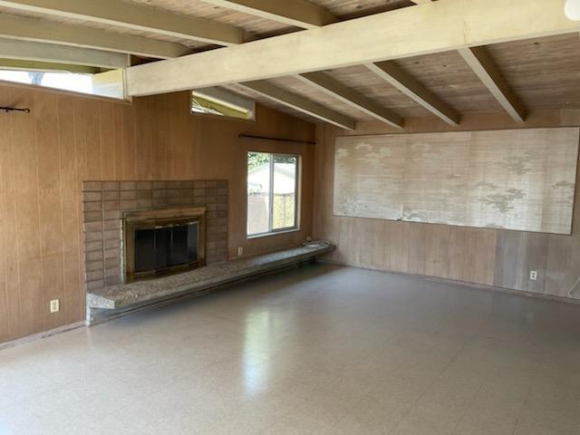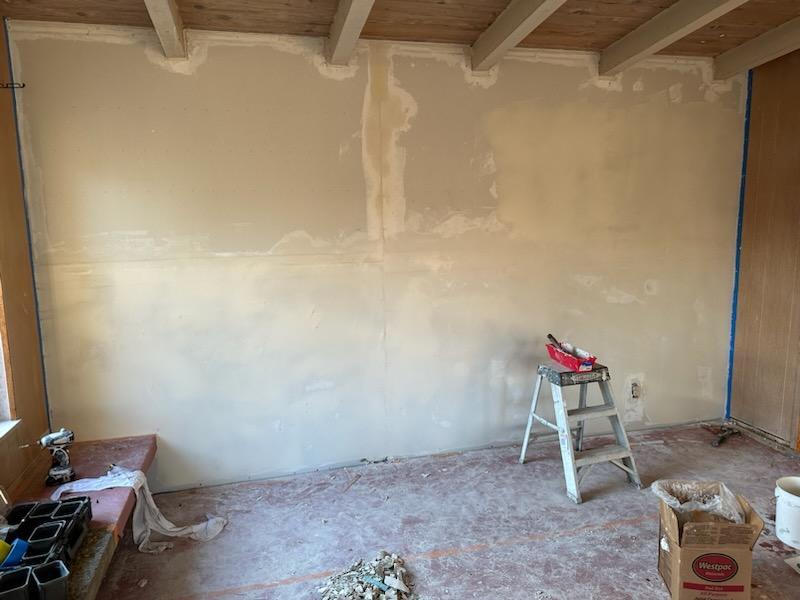 This drywall was popping at the seams! And there was a horrible wood bulletin board that needed to be removed. We skim coated the wall, primed and painted. We also re-coated the wood beams on the ceiling while we were at it.