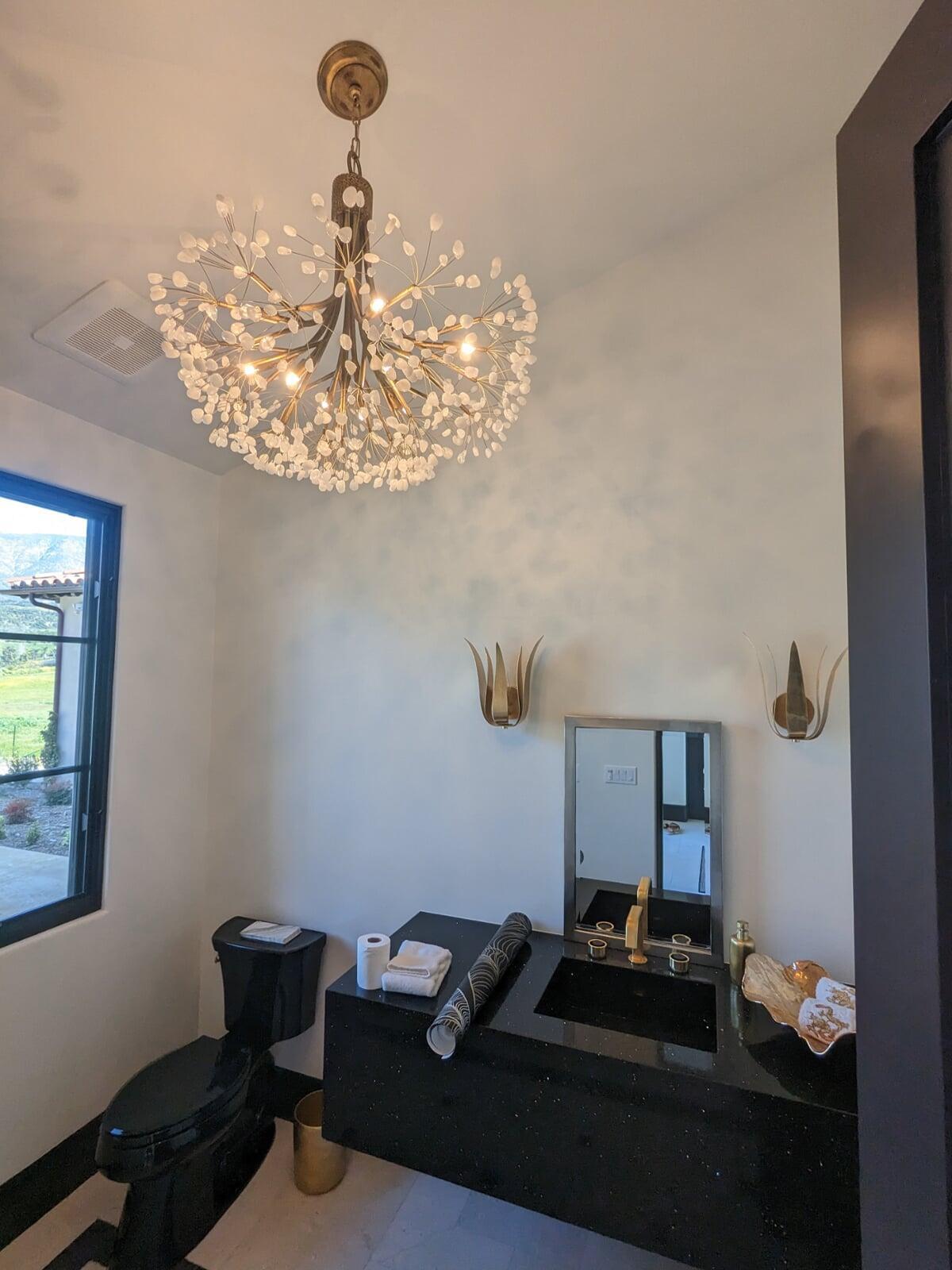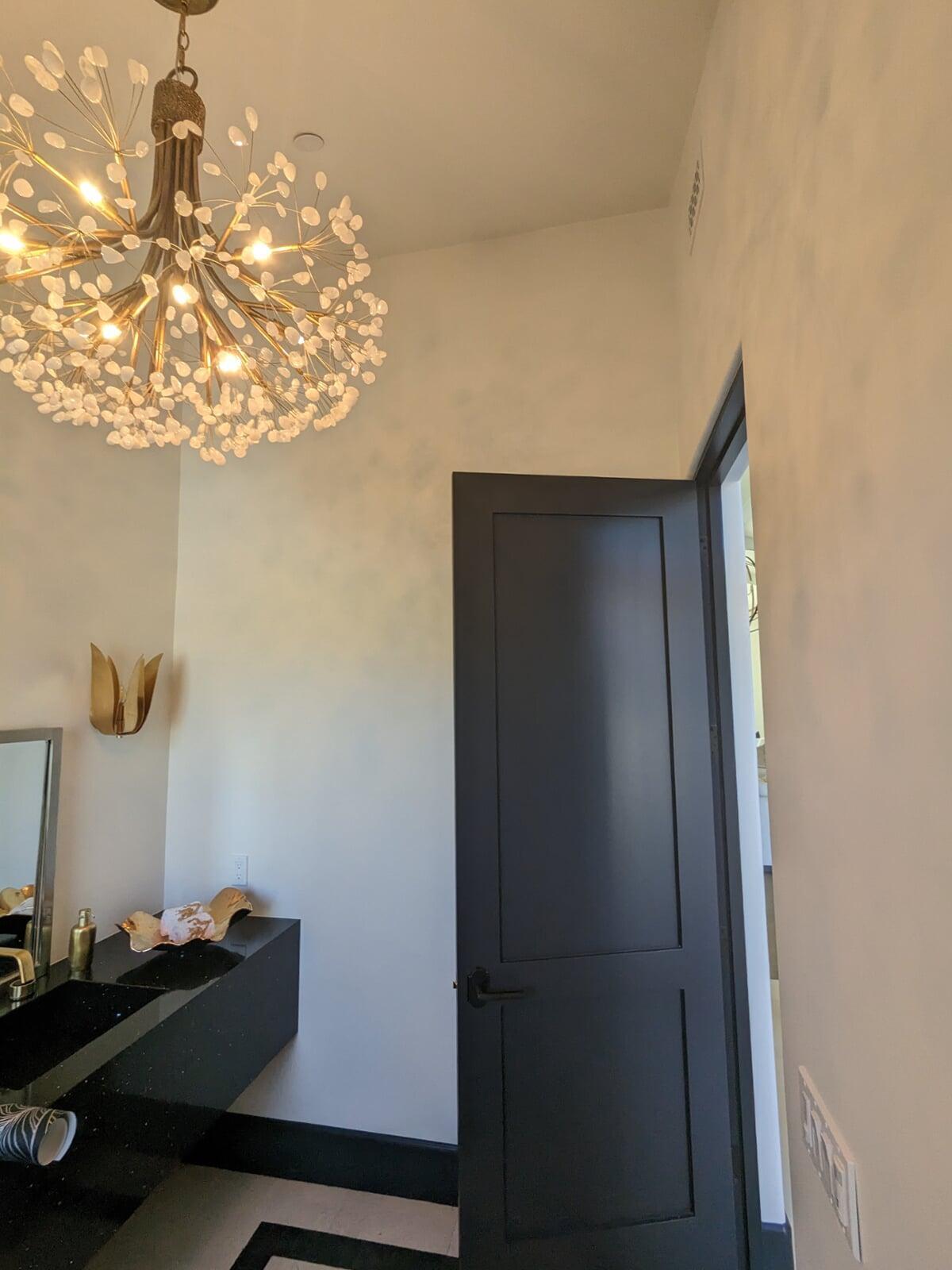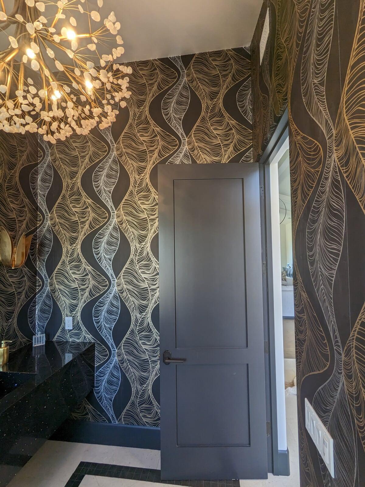 This small powder room was already painted and had to be sanded and then primed so that it was ready for wallpaper. We then installed this very fancy gold leaf effect wallpaper that the owner supplied. The priming took one half day and the install took one half day, done on separate days. Simply stunning!